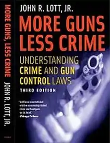 More Guns, Less Crime is a book by John R. Lott Jr. that says violent crime rates go down when states pass "shall issue" concealed carry laws. He presents the results of his statistical analysis of crime data for every county in the United States during 29 years from 1977 to 2005. Each edition of the book was refereed by the University of Chicago Press. The book examines city, county and state level data from the entire United States and measures the impact of 13 different types of gun control laws on crime rates. The book expands on an earlier study published in 1997 by Lott and his co-author David Mustard in The Journal of Legal Studies[1] and by Lott and his co-author John Whitley in The Journal of Law and Economics, October 2001.[2]