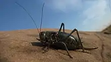 The Mormon cricket (Anabrus simplex) is a large insect native to western North America in rangelands dominated by sagebrush and forbs. Despite its name, the Mormon cricket is actually a shield-backed katydid. It takes its name from Mormon settlers in Utah, who encountered them while pushing westward, and for the prominent role they play in the miracle of the gulls.[2]