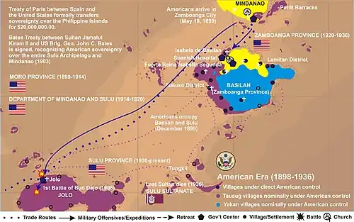 Following the American occupation of the Northern Philippines during 1899, Spanish forces in the Southern Philippines were abolished, and they retreated to the garrisons at Zamboanga and Jolo. American forces took control over the Spanish government in Jolo on May 18, 1899, and at Zamboanga in December 1899.[8]