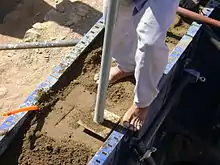 The walls were built from bottom to top one level at a time. Workers pressed and packed in the materials into sections ranging from 50 and 70 cm in length that were each held together temporarily by wooden boards. Once the material was settled, the wooden restraints could be removed and the process was repeated on top of the previously completed level.[99][101] This process of initial wooden scaffolding often leaves traces in the form of multiple rows of little holes visible across the face of the walls.[3] In many cases walls were covered with a coating of lime, stucco, or other material to give them a smooth surface and to better protect the main structure.[2]