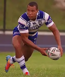 In the preseason, Mbye again played for the Bulldogs in the Auckland Nines.[25] In 2015, he established himself as a regular part of the Bulldogs' side.[26] His form saw the interest for his signature in 2017 rise significantly.[27][28][29] In Round 4 against the Wests Tigers, he kicked a field goal in golden-point extra time to win the match for the Bulldogs, 25-24.[30] In Round 7 against the Manly Warringah Sea Eagles, he scored his first NRL career try in the 28-16 win at ANZ Stadium.[31][32] He finished off the 2015 season having played in 23 matches, scoring 3 tries, kicking 15 goals and 2 field goals.[26]