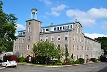 The second mill began producing nails in 1814, and five years later its owner, Ruggles Whiting of Boston, sold it to the owner of the first mill, George Bird, who began using the whole site to manufacture paper.[63] In 1823 it switched to cotton, using the machinery of the former Norfolk Cotton Company. In 1835 a new stone mill was erected.[73] It stands today, and was converted into a condominium complex in 1986–87.[6] Unlike the other mills, which were constructed in a strictly utilitarian style, this factory boasted a date stone reading "1835" and a dome-roofed cupola over the mill bell.[66] Together they stood as a testament to the primacy of the mills in the neighborhood.[66][67]