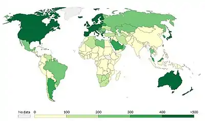 Global vehicle ownership in 2010 was 148 vehicles in operation per 1000 people, a ratio of 1:6.75 vehicles to people, slightly down from 150 vehicles per 1000 people in 2009, a rate of 1:6.63 vehicles to people.[5] The global rate of motorization increased in 2013 to 174 vehicles per 1000 people.[11] In developing countries vehicle ownership rates rarely exceed 200 cars per 1,000 population.[12]