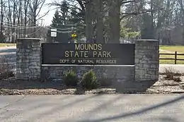 ![]() Mounds State Park entrance sign. | |