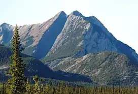 Mount Ernest Ross is a 2,454-metre (8,051-foot) double summit mountain located in the North Saskatchewan River valley of the Canadian Rockies of Alberta, Canada. Mount Ernest Ross can be seen from the David Thompson Highway at the southern end of Abraham Lake. Precipitation runoff from the peak drains east into the lake. Mount William Booth is across the lake to the east, and Kootenay Plains and Ex Coelis Mountain are situated to the southeast. Its nearest higher peak is Elliott Peak, 3 km (1.9 mi) to the immediate north.[3][2]