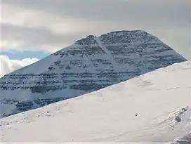 Mount Haig is located on the border of Alberta and British Columbia on the Continental Divide. It was named in 1862 after Haig, Captain R.W.[4][2] Mount Haig is the highest peak of Gravenstafel Ridge; its lower north and east faces feature as back country cat skiing for Castle Mountain Resort on neighbouring Gravenstafel Mountain.