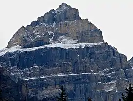 The mountains in Banff Park are composed of sedimentary rock laid down during the Precambrian to Jurassic periods.[5] Formed in shallow seas, this sedimentary rock was pushed east and over the top of younger rock during the Laramide orogeny.[6]