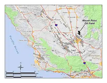 The Mount Poso Oil Field is a large oil and gas field in the lower foothills of the Sierra Nevada in Kern County, California, United States. Discovered in 1926, it is the 21st largest field in California by total ultimate oil recovery, having a cumulative production of close to 300 million barrels (48,000,000 m3).[1] The current principal operator of the field is California Resources Corporation; 652 wells remained active at the end of 2006, while production had dwindled to 554,000 barrels (88,100 m3) during that year, from a peak of over 9 million barrels (1,400,000 m3) in 1981.[2]