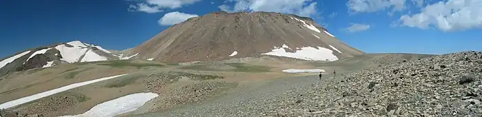 The mountain has two peaks, east and west, separated by a 1.5 km-wide basin; there are two small lakes in this basin.[6] The eastern summit is much larger in area and consists of "a wide snow-covered platform of cairn-like bare rock peaks".[6] From here, the whole northern shore of Lake Van is visible, along with Mount Ararat, the Murat Su plain, and even the Palandöken Dag south of Erzurum.[6] The smaller western summit has fields of lava boulders.[6] A narrow ridge connects the two peaks.[6] All sides of the mountain are marked by lava "ribs".[6] The slope is fairly gentle on all sides except the north.[6]