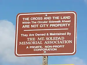 On July 20, 2015, a group called the Mt. Soledad Memorial Association reported that it had bought the land under the cross from the Dept. of Defense for $1.4 million.[63] On September 7, 2016 the 9th U.S. Circuit Court of Appeals issued a one-page ruling, ordering dismissal of the case and an end to all current appeals, stating that the case was now moot because the cross was no longer on government land. Both sides agreed that this decision puts a final end to the case. An ACLU spokesman said, "I think this now resolves the case. The government doesn't own the cross or the land underneath it any more. The government is no longer in the business of endorsing religion."[64]