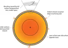 The thrust faulting and uplifting of large crust blocks on Io are interpreted by a model proposed by Schenk and Bulmer's 1998 paper.[3] In the model, Io's crust keeps recycling. Violent volcanic activity brings lava to the surface and older, buried layers are forced to subside. The old volcanic crust materials are compressed laterally as they sink.