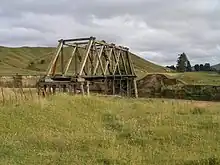 Five kilometres of the Moutohora branch remain open to Makaraka, functioning as an industrial siding to service a fruit storehouse.[21] Many remains of the embankments, cuttings, bridge abutments and tunnels can be seen from State Highway 2 from near Ormond to Matawai. About 5 km of the old roadbed is now the Otoko recreational walkway. Just past the northern end of the walkway, the abutments and one of the steel piers of the 30m high Otoko viaduct are clearly visible to the east of the highway.[22] Between Otoko and Rakauora the current highway runs largely on the old railway alignment, and the piers of the Rakauora viaduct still stand about 100m to the west of the highway just before reaching Rakauora. The Matawhai station platform edge can be seen alongside the Matawai-Moutohora road, and the Motu river bridge truss remains in situ. Some railway buildings remain at various places up and down the old line, but there are now no railway remains left at the site of the Moutohora terminus.