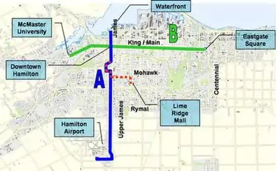 - Hamilton east-west LRT(Light Rail Transit) on King/Main Streets from Eastgate Mall to McMaster University