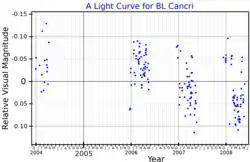 Mu1 Cancri, Latinised from μ1 Cancri, is a variable star in the zodiac constellation of Cancer. The name Mu1 comes from the Bayer naming system: the "1" in the name is because (from Earth) it appears to be close to 10 Cancri, or Mu2 Cancri. It is also known by the variable star designation BL Cancri. The star is dimly visible to the naked eye with an apparent visual magnitude that ranges from 5.87 down to 6.07.[4] Parallax measurements put it about 630 light-years (192 parsecs) from the Sun.[10] At that distance, the visual magnitude is diminished by an extinction factor of 0.28.[11] The position of the star near the ecliptic means it is subject to lunar occultations.[12]