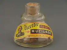 Mucilage mixed with water has been used as a glue, especially for bonding paper items such as labels, postage stamps, and envelope flaps.[7] Differing types and varying strengths of mucilage can also be used for other adhesive applications, including gluing labels to metal cans, wood to china, and leather to pasteboard.[8] During the fermentation of nattō soybeans, extracellular enzymes produced by the bacterium Bacillus natto react with soybean sugars to produce mucilage. The amount and viscosity of the mucilage are important nattō characteristics, contributing to nattō's unique taste and smell.