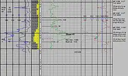Mud logging includes observation and microscopic examination of drill cuttings (formation rock chips), and evaluation of gas hydrocarbon and its constituents, basic chemical and mechanical parameters of drilling fluid or drilling mud (such as chlorides and temperature), as well as compiling other information about the drilling parameters. Then data is plotted on a graphic log called a mud log. Example1, Example2.
