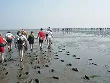Mudflat hiking (Danish: Vadehavsvandring, Dutch: Wadlopen, West Frisian: Waadrinnen, German: Wattwandern) is a recreation enjoyed in the Netherlands, northwest Germany, Denmark, England and France. Mudflat hikers are people who, with the aid of a tide table, use a period of low water to walk and wade on the watershed of the mudflats, especially from the Frisian mainland coast to the Frisian islands.[1]