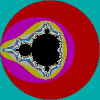 and if the exponent is negative the sequence is stable. The white pixels in the picture are the parameters c for which the exponent is positive aka unstable. The colours show the periods of the cycles which the orbits are attracted to. All points colored dark-blue (outside) are attracted by a fixed point, all points in the middle (lighter blue) are attracted by a period 2 cycle and so on.