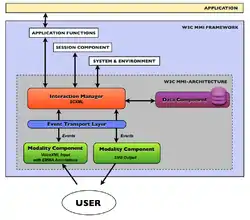 Multimodal Architecture and Interfaces is the specified description of a larger services infrastructure called The Runtime Framework which provides the main functions that a multimodal system can need. This framework is at a higher level of abstraction than the MMI architecture.[2] The MMI Runtime Framework is the runtime support and communication modules of the multimodal system while MMI Architecture is the description and the specification of its main modules, its interfaces and its communication modes.