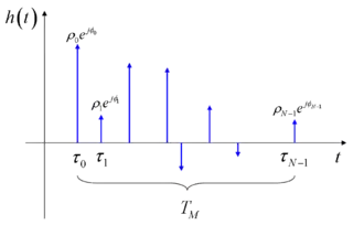 where is the number of received impulses (equivalent to the number of electromagnetic paths, and possibly very large), is the time delay of the generic impulse, and represent the complex amplitude (i.e., magnitude and phase) of the generic received pulse. As a consequence, also represents the impulse response function of the equivalent multipath model.
