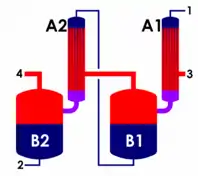 A multiple-effect evaporator, as defined in chemical engineering, is an apparatus for efficiently using the heat from steam to evaporate water.[1] Water is boiled in a sequence of vessels, each held at a lower pressure than the last. Because the boiling temperature of water decreases as pressure decreases, the vapor boiled off in one vessel can be used to heat the next, and only the first vessel (at the highest pressure) requires an external source of heat. While in theory, evaporators may be built with an arbitrarily large number of stages, evaporators with more than four stages are rarely practical except in systems where the liquor is the desired product such as in chemical recovery systems where up to seven effects are used.