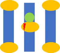 The earliest implementation of multiple patterning involved line cutting. This first occurred for Intel's 45nm node, for 160 nm gate pitch.[41] The use of a second mask to cut lines defined by a first mask does not help increase feature density directly. Instead it allows definition of features, e.g., brick patterns, which are based on lines spaced at a minimum pitch, in particular, when the lines are near the resolution limit and are generated by the two-beam interference mentioned above. The two-beam interference still dominates the diffraction pattern.[38] In fact, in the absence of a separate cut exposure, the gap between the ends of the minimum pitch lines will be prohibitively large.[42][43] This is due to rounding resulting from reduced spatial frequencies.[44]