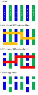 Self-aligned blocking or cutting is currently being targeted for use with SAQP for sub-30 nm pitches.[82] The lines to be cut are divided into two materials, which can be etched selectively. One cut mask only cuts every other line made of one material, while the other cut mask cuts the remaining lines made of the other material. This technique has the advantage of patterning double pitch features over lines at the minimum pitch, without edge placement errors.[37] Cut-friendly layouts are processed with the same minimum number of masks (3), regardless of using DUV or EUV wavelength.[83]
