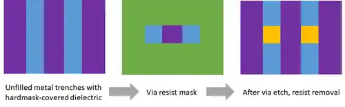 Self-aligned contact and via patterning is an established method for patterning multiple contacts or vias from a single lithographic feature. It makes use of the intersection of an enlarged feature resist mask and underlying trenches which are surrounded by a pre-patterned hardmask layer. This technique is used in DRAM cells[53] and is also used for advanced logic to avoid multiple exposures of pitch-splitting contacts and vias.[54][55][56]