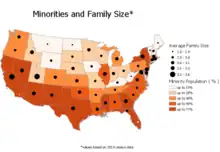 A multi-layered thematic map, displaying minority proportion as a choropleth, and family size as a proportional symbol