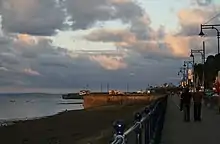 The first human crop growers arrived in the area over 5,000 years ago.[2] However, evidence of human habitation is much older and possibly dates as far back as 30,000 years ago—established by the dating of the famous Paviland skeleton located in a cave some 10–15 miles along the coast from Mumbles Head.[3] The skeleton is kept in the Oxford Museum of Natural History, having been excavated by Rev William Buckland, who was Professor of Geology at Oxford University at the time. However, Swansea Museum has two well-finished flint axe-heads, one from Newton and one from an allotment on Mumbles Hill. Much of what we know about the first metalworkers, in the Bronze Age, has been learned from their tombs: pieces of pottery, a cairn and remains of a hut were found. The cliffs above the Redcliffe flats at Caswell Bay contain the ridged remnants of a Redley Cliff Iron Age hill-fort.