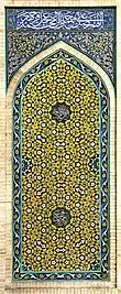 The works in an album, typically of different original sizes, were trimmed or mounted on standard size pages, often with new border decoration being added. When the compilation was considered complete it was bound, often very luxuriously, with an Islamic book-cover that might be highly decorated with lacquered paint, gold stamping on leather, or other techniques. Other muraqqa might be bound in a special concertina-like form. Many were arranged with pages of calligraphy facing miniatures, the matching of verse to image allowing some scope for the creativity of the compiler.[4] Albums containing only calligraphy tended to be arranged chronologically to show the development of a style. The bindings of many albums allowed items to be added and removed, or they were just removed from the centre of the page, and such changes were often made; some albums had marks which allow changes to be traced.[5] The grandest albums had specially written prefaces which are the source of a high proportion of surviving contemporary writing on the arts of the book, and the biographies of painters and calligraphers; these tended to be written by calligraphers. For calligraphers too the single page for an album became the "bread and butter" source of income,[6] using mostly texts from poetry, whether extracts from a long classic or ghazal lyrics, but sometimes an extract from the Qur'an, perhaps given the place of honour at the start of the album. Album pages often have areas of decorated illumination (as in the illustration) that share their motifs with other media, notably book-covers and carpet designs, the best of which were in fact probably mostly produced by the same type of artist at court, and sent to the weavers.[7]