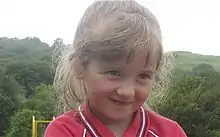 April Sue-Lyn Jones[2] (4 April 2007[3] – c. 1 October 2012) was a Welsh child from Machynlleth, Powys, who disappeared on 1 October 2012, after being sighted getting into a vehicle near her home. The disappearance of April Jones, aged five, generated a large amount of national and international press coverage.[4][5][6] A 46-year-old English man, Mark Bridger, was subsequently arrested and convicted.[7]