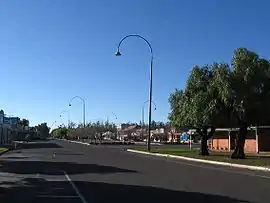 Sturt Highway was rerouted to reach Renmark through Victoria instead of via Wentworth in 1939,[9] subsuming the alignment of the Murray Valley Highway between Mildura and the state border with South Australia; it was subsequently truncated to terminate at Calder Highway in Hattah. Robinvale Road, a 2-mile road connecting the "irrigation settlement of Robinvale" to the highway, was declared a Main Road when it was surfaced for the first time in 1952,[10] and later declared a State Highway as Robinvale Highway in June 1983, between Robinvale and Lake Powell.[11][12]