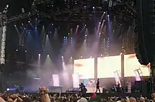Before the release of the new album, Muse made several promotional TV appearances starting on 13 May 2006 at BBC Radio 1's Big Weekend. The Black Holes and Revelations Tour started before the release of their album and initially consisted mostly of festival appearances, including a headline slot at the Reading and Leeds Festivals in August 2006.[45] The band's main touring itinerary started with a tour of North America from late July to early August 2006. After the last of the summer festivals, a tour of Europe began, including a large arena tour of the UK.[45] Muse recruited an additional touring member, Morgan Nicholls, on keys, percussion and guitar; he performed with them until 2022.[46]