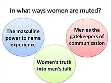 Houston and Kramarae posit that women have been silenced in many ways by for example ridiculing women's related lexicon, trivializing their opinions, ideas, and concerns, and censoring women's voices.[16] According to the research, women’s voice can be ridiculed even in a medical context.[17]