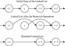 A simple example of why mutual exclusion is important in practice can be visualized using a singly linked list of four items, where the second and third are to be removed. The removal of a node that sits between two other nodes is performed by changing the next pointer of the previous node to point to the next node (in other words, if node i is being removed, then the next pointer of node i – 1 is changed to point to node i + 1, thereby removing from the linked list any reference to node i). When such a linked list is being shared between multiple threads of execution, two threads of execution may attempt to remove two different nodes simultaneously, one thread of execution changing the next pointer of node i – 1 to point to node i + 1, while another thread of execution changes the next pointer of node i to point to node i + 2. Although both removal operations complete successfully, the desired state of the linked list is not achieved: node i + 1 remains in the list, because the next pointer of node i – 1 points to node i + 1.