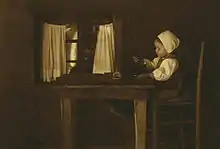- "All things considered, we consider Mrs. Wiggins' picture called Polishing Brass one of the finest in the whole room. It certainly is the most pictorial, and is exactly like a print by Chodowiecke [sic], both in subject and feeling. A woman is seated at a table with metal utensils of quaint and interesting form. The whole thing is quiet, healthy, and exceedingly well-designed – an example for hundreds."[1]