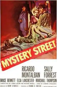 Mystery Street is a 1950 American black-and-white film noir featuring Ricardo Montalbán, Sally Forrest, Bruce Bennett, Elsa Lanchester, and Marshall Thompson.[3] Produced by MGM, it was directed by John Sturges with cinematography by John Alton.