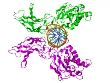 All proteins of the NF-κB family share a Rel homology domain in their N-terminus. A subfamily of NF-κB proteins, including RelA, RelB, and c-Rel, have a transactivation domain in their C-termini. In contrast, the NF-κB1 and NF-κB2 proteins are synthesized as large precursors, p105 and p100, which undergo processing to generate the mature p50 and p52 subunits, respectively. The processing of p105 and p100 is mediated by the ubiquitin/proteasome pathway and involves selective degradation of their C-terminal region containing ankyrin repeats. Whereas the generation of p52 from p100 is a tightly regulated process, p50 is produced from constitutive processing of p105.[18][19] The p50 and p52 proteins have no intrinsic ability to activate transcription and thus have been proposed to act as transcriptional repressors when binding κB elements as homodimers.[20][21] Indeed, this confounds the interpretation of p105-knockout studies, where the genetic manipulation is removing an IκB (full-length p105) and a likely repressor (p50 homodimers) in addition to a transcriptional activator (the RelA-p50 heterodimer).