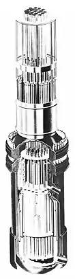 The reactor was de-fuelled in 1975, but remains in place. The reactor is 17 ft (5.2 m) high with a core 62 in (160 cm) in diameter and 66 in (170 cm) high, with 32 fuel elements. Each fuel element was 1⁄2 in (13 mm) in diameter and housed 164 uranium oxide pellets enriched to an average of 4.4% U-235. The 16 center elements were enriched to 4.2%, and the outer 16 elements to 4.6%. The pellets were 0.4244 in (10.78 mm) in diameter, with pressurized helium gas in the annular space between the pellets and the element walls. Twenty-one control rods were provided, 66 in (170 cm) long, 8 in (20 cm) across and 3⁄8 in (9.5 mm) thick. The rods could be fully inserted in 1.6 seconds by electric drive.[10]