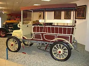 The car was initially a four-seater, but later also other variants were made (including 6-seater). The car had rectangular frame, 12 horsepower engine located under the floor, in front of the rear axle. The fuel tank, reservoir for the coolant as well as the radiator were located under the front hood. The steering column with a steering wheel was inclined. The subsequent types C, D, E, F were produced in small numbers. Apart from the E they had flat-four water-cooled engines, transversely mounted, directly under the driver's floorboard.[1]