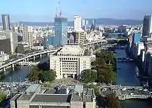 Nakanoshima (中之島) is a 3 km long and 50 hectares narrow sandbank in Kita-ku, Osaka city, Japan, that divides the Kyū-Yodo into the Tosabori and Dōjima rivers. Many governmental and commercial offices (including the city hall of Osaka), museums and other cultural facilities are located on Nakanoshima.