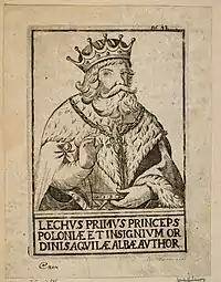 Depiction of the legendary ruler Lech, with the description: "Lech the first prince of Poland"