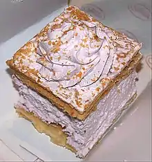 Napoleonka (Slovak: krémeš), colloquially kremówka, is a Polish type of cream pie. It is made of two layers of puff pastry, filled with whipped cream, creamy buttercream, vanilla pastry cream (custard cream) or sometimes egg white cream, and is usually sprinkled with powdered sugar.[1] It also can be decorated with cream or covered with a layer of icing.