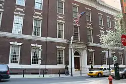 The club's foundation stone on the modern clubhouse was laid by Gladstone on 9 November 1884, when he declared "Speaking generally, I should say there could not be a less interesting occasion than the laying of the foundation-stone of a Club in London. For, after all, what are the Clubs of London? I am afraid little else than temples of luxury and ease. This, however, is a club of a very different character", and envisioned the club as a popular institution for the mass electorate.[7] However, another of the club's founders, G. W. E. Russell, noted "We certainly never foresaw the palatial pile of terra-cotta and glazed tiles which now bears that name. Our modest object was to provide a central meeting-place for Metropolitan and provincial Liberals, where all the comforts of life should be attainable at what are called 'popular prices'", but added "at the least, we meant our Club to be a place of "ease" to the Radical toiler. But Gladstone insisted that it was to be a workshop dedicated to strenuous labour."[7] Funds for the clubhouse were raised by selling 40,000 shares of £5 each (equivalent to £554 in 2021), in a Limited Liability Company, with the unusual stipulation that "No shareholder should have more than ten votes", so as to prevent a few wealthy men from dominating the club.[4] However, this only raised £70,000 (equivalent to £7,762,829 in 2021),[5] and so an additional £52,400 was raised for the construction of the clubhouse by the Liberal Central Association.[8] The remaining £30,000 necessary was raised by mortgage debentures.[5]