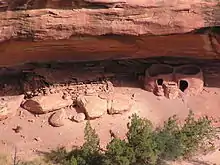 Horsecollar Ruin is an Ancestral Puebloan ruin visible from an overlook a short hike from Bridge View Drive. The site was abandoned more than 700 years ago but is in a remarkable state of preservation, including an undisturbed rectangular kiva with the original roof and interior, and two granaries with unusual oval-shaped doors whose shape resembles horse collars (hence the site's name).
