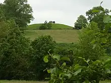 In the eighth century BC (Bronze Age), a ring of timber poles was raised at the western site, where the high mound now stands. It was 35m in diameter and surrounded by a ring ditch with an eastern entrance.[7] This ditch was 45 metres (148 feet) in diameter, 5 metres (16 feet) wide and 1 metre (3.3 feet) deep. In the fourth century BC (Iron Age) a new wooden structure was built on the same spot. It was a round building attached to a bigger round enclosure, making a figure-of-eight shape, both with eastern entrances. The larger ring of the figure-of-eight was 30 metres (98 feet) in diameter, the smaller about 20 metres (66 feet). The smaller building had a hearth. The structure has been interpreted as a roundhouse with an attached yard or pen, or a building with an attached enclosure for rituals. Finds suggest that at this time the site was occupied by someone of high standing such as a king, chieftain or druid.[7] They include a chape, a finely-decorated pin and the skull of a Barbary monkey, which was likely a pet that was either imported or given as a gift.[8] The structure was rebuilt several times over the following centuries.[7]