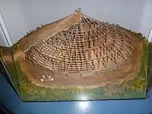 In the first century BC, a huge timber roundhouse-like structure was built on the same spot. It was 40 metres in diameter and consisted of an outer wall and four inner rings of posts (probably holding up a roof), which circled a huge central pillar.[7] This oak pillar has been dated by dendrochronology to the year 95 BC: 61 and could have stood about 13 metres tall.[9] The building had a western entrance, toward the setting sun, which suggests it was not a dwelling. A ditch and bank were dug around it. There is evidence that the huge ditch and bank that encircles the hill was dug at about the same time.[10]