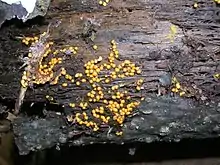 Nectria peziza or yellow spot is an ascomycete fungus with bright yellow to orange globose fruiting bodies (0.2 – 0.4 mm across) found on rotting polypores, well rotted deadwood, bark, dung, and decaying cloth.[1][2] Its globular fruiting bodies (peritheca), quite large for the genus, may be isolated or crowded; they have a slightly prominent black dot at the top, the ostiolum, this being the entrance to the inner cavity;[3] the bodies often collapse into a cup-shape when dry[1] and the colour fades to pale yellow or whitish.