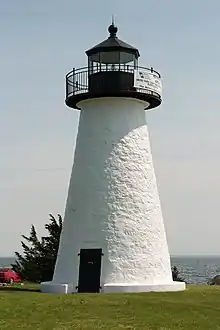 Ned Point Light is a historic lighthouse on Ned's Point Road in Mattapoisett, Massachusetts.[4][5][6] The lighthouse was built in 1838 at a cost of approximately $5,000, and named after Ned Dexter, a local farmer. Under the supervision of a local builder, Leonard Hammond, the lighthouse was constructed with a birdcage-style lantern similar to Bird Island Light found in Marion, Massachusetts. The stone used for the lighthouse was all locally sourced, with most of it originating from nearby beaches. Inside, there are 32 granite steps that are cantilevered to the outside wall without the use of mortar. The original lantern used 11 whale oil lamps, each with its own parabolic reflector. The lamps and reflectors were replaced by a fifth order Fresnel lens in 1857, along with a change to an octagonal lantern. The Great Blizzard of 1888 significantly damaged the keeper's stone house, resulting in it being demolished and the building of a wooden replacement.[2]